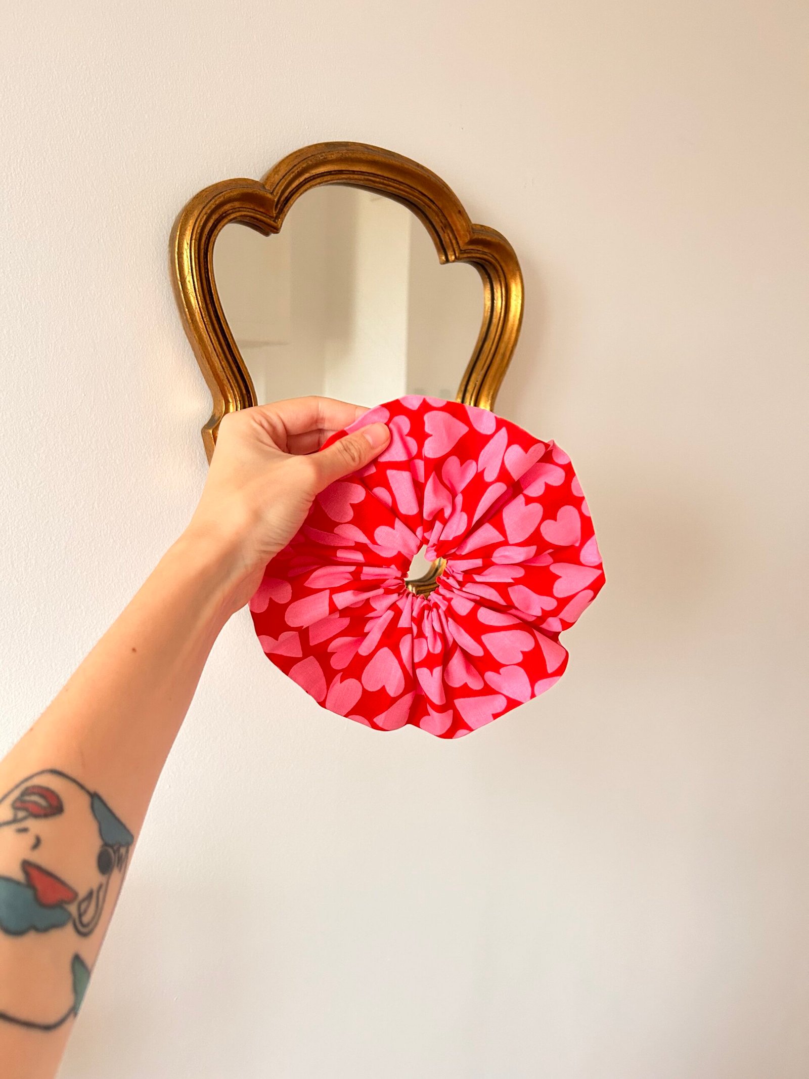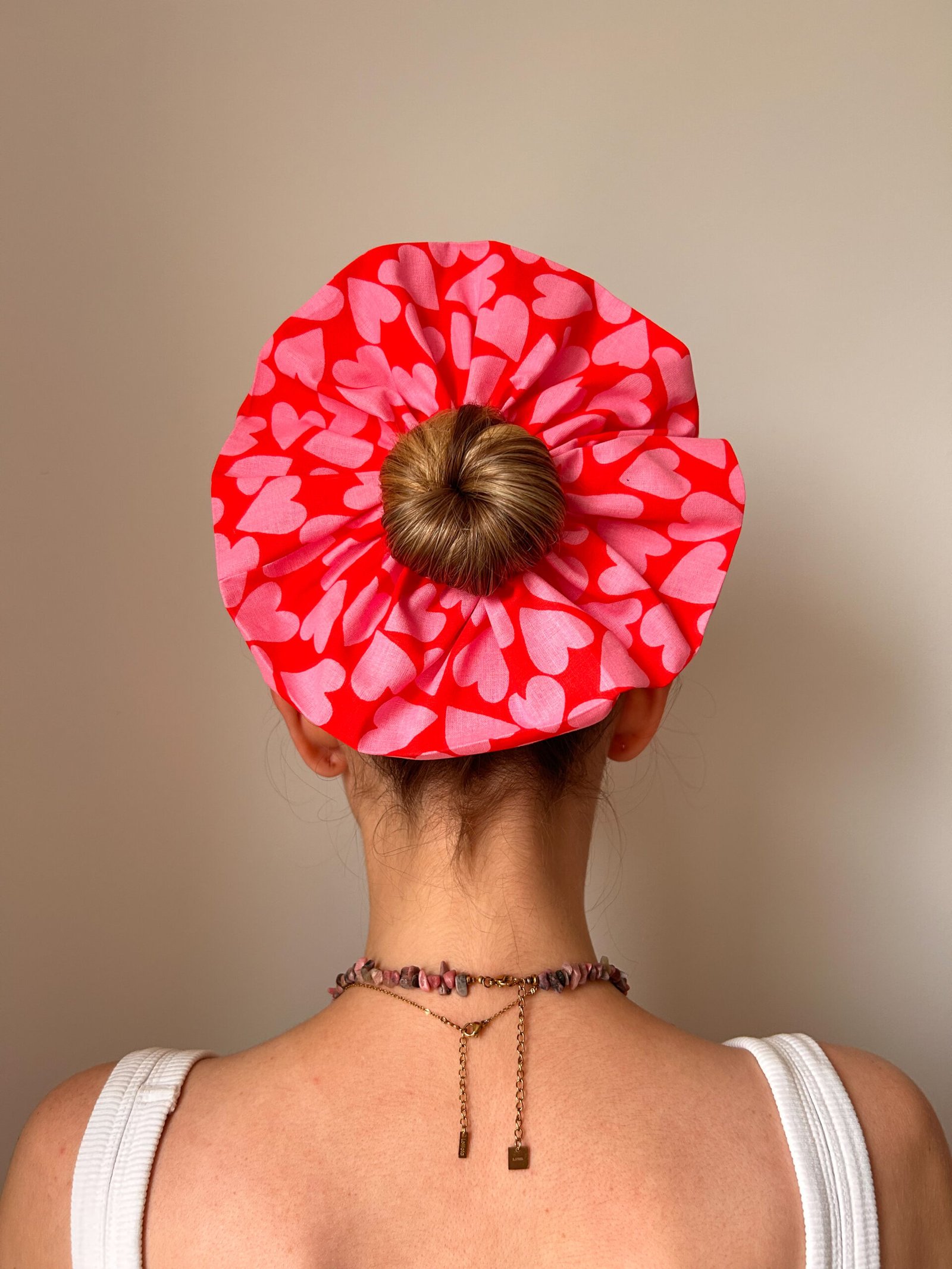 Chouchou XL fait main rouge à cœurs roses.