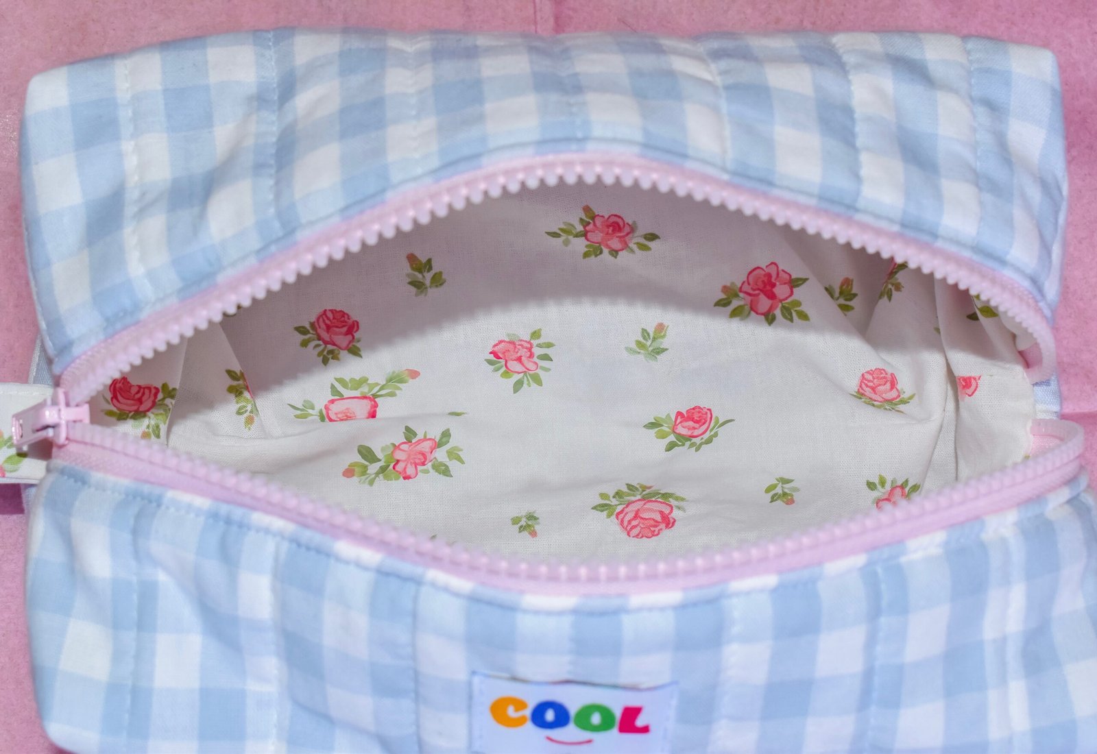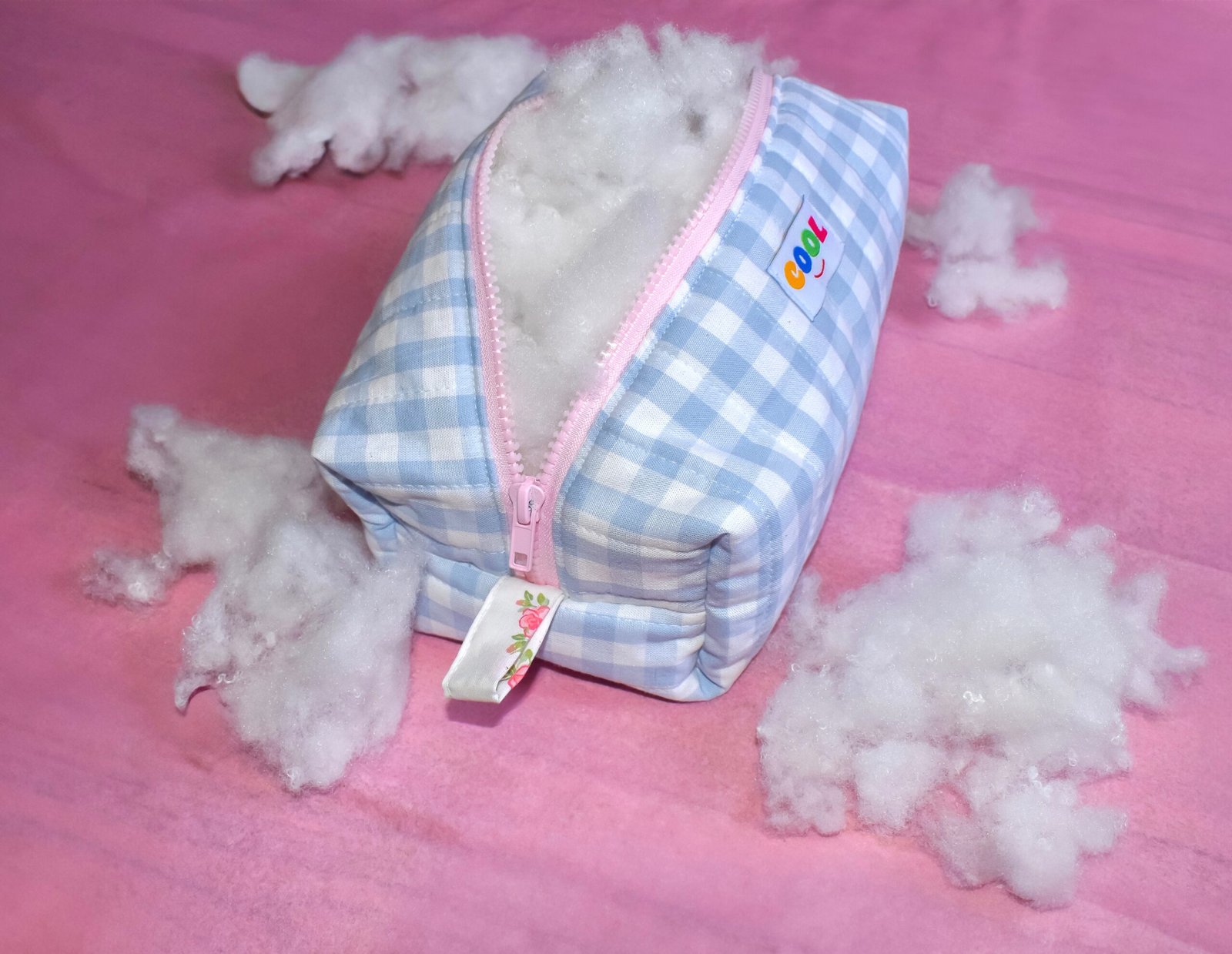 Trousse de toilette ou pochette multi – usages, cousue à la main avec un tissu à carreaux bleu et blanc.